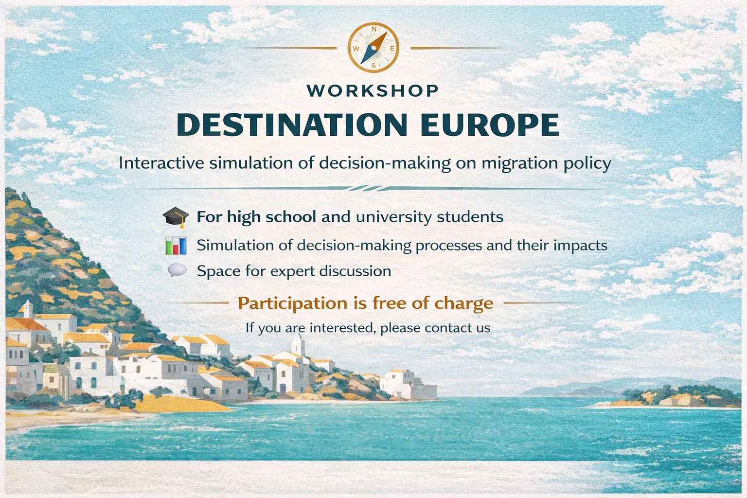 Students will take part in the Destination Europe interactive tool, stepping into the roles of different actors and exploring the challenges and impacts of migration policy through concrete scenarios.